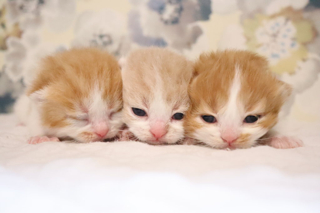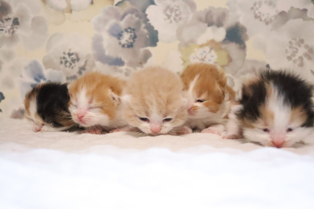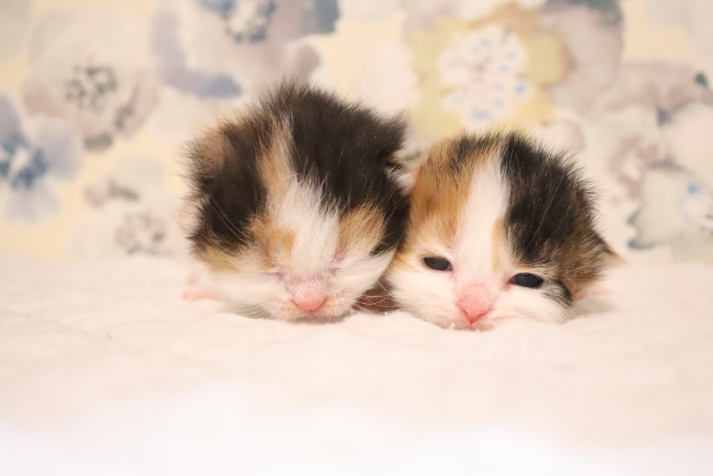 もうすぐ生後2週目になります。目が開いてきましたが、大きな目です。とても可愛いくなりますよ。キャリコだけが女の子です。